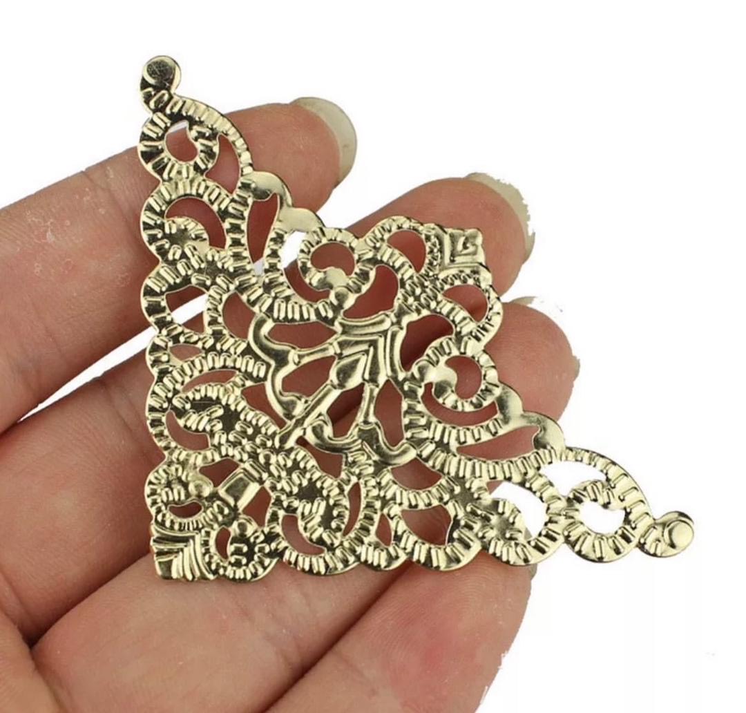زاوية حديدية زخرفية بتصميم تاجي فاخر بلون ذهبي، بحجم كبير (٧٦×٥٦ ملم)، مناسبة لتزيين الصناديق الخشبية والصناديق التقليدية والتغليف الفاخر. مصنوعة من الحديد بلمعة ذهبية أنيقة.