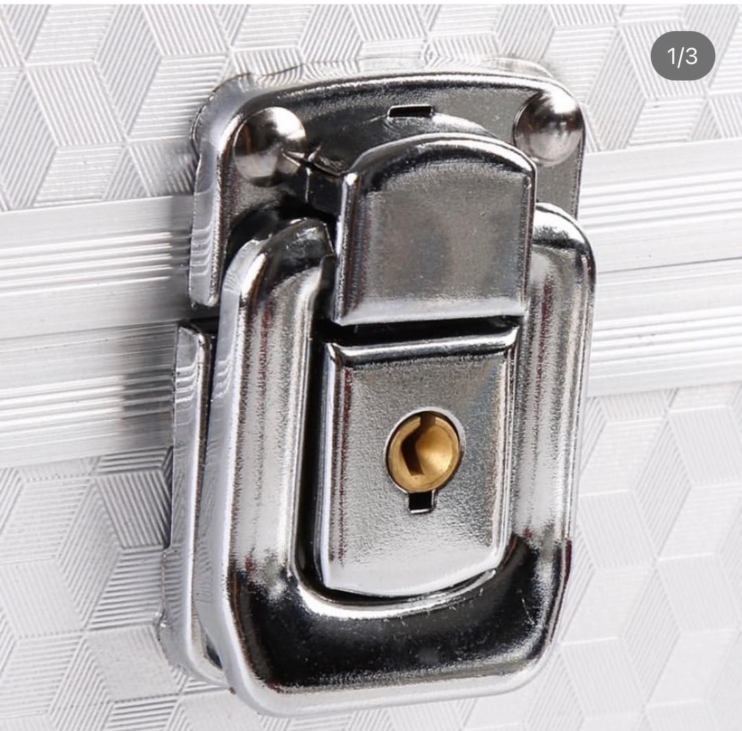 قفل صغير بمفتاح، بقياس ٣×٤ سم، مصنوع من الحديد المطلي باللون الفضي اللامع. مناسب لصناديق الخشب، الحقائب اليدوية، العلب اليدوية أو الصناديق الفاخرة. يأتي في عبوة ٥٠ قطعة، مثالي للتجار والحرفيين ومتاجر الإكسسوارات.